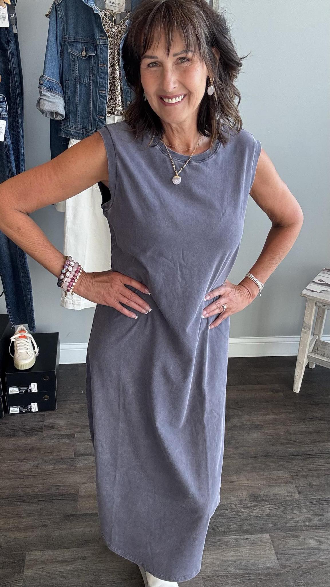 The Camille Dress in graphite commands attention with its sleek silhouette and daring length that hits just above the ankle. This bold design elevates your style, offering a striking balance between elegance and edge for any occasion.