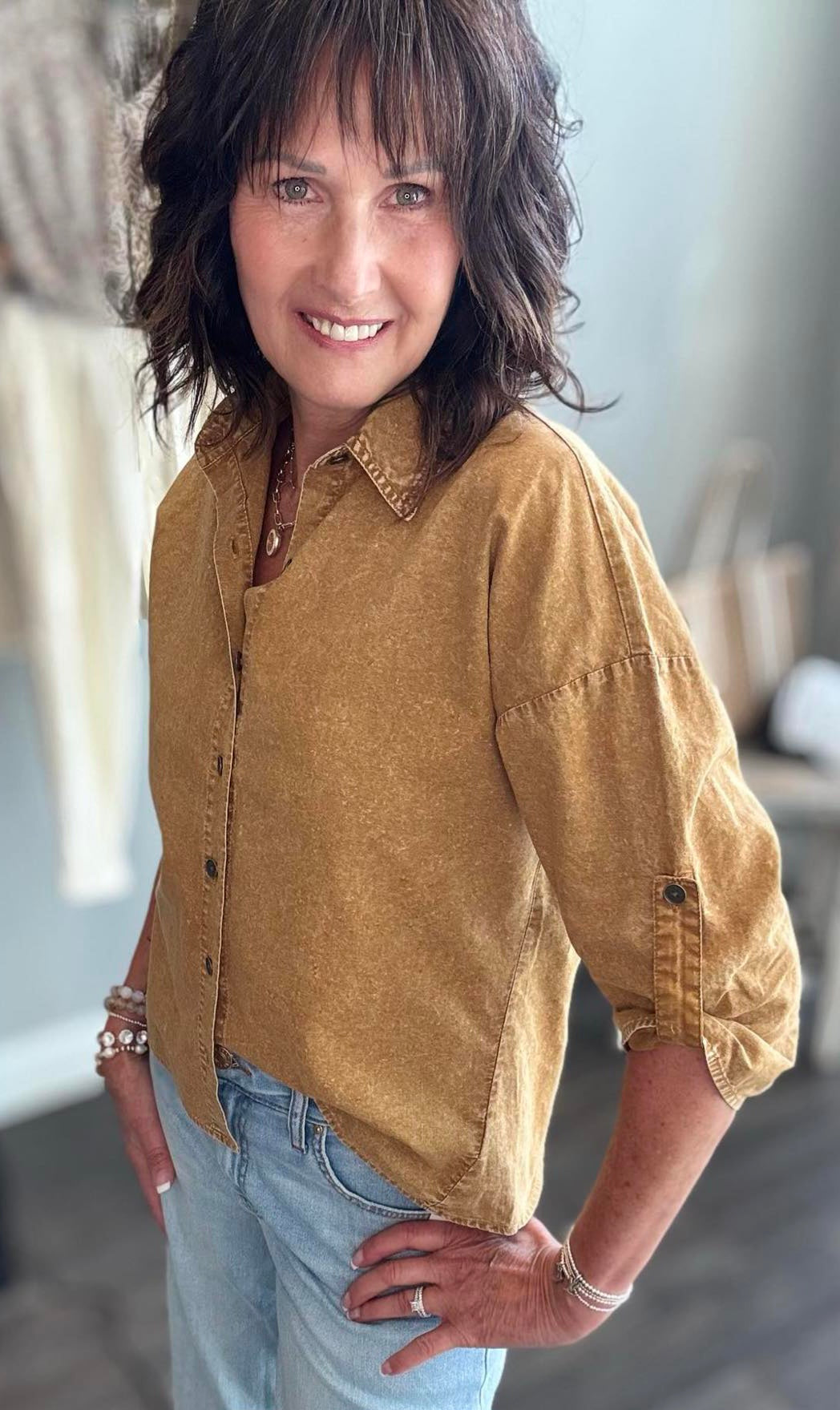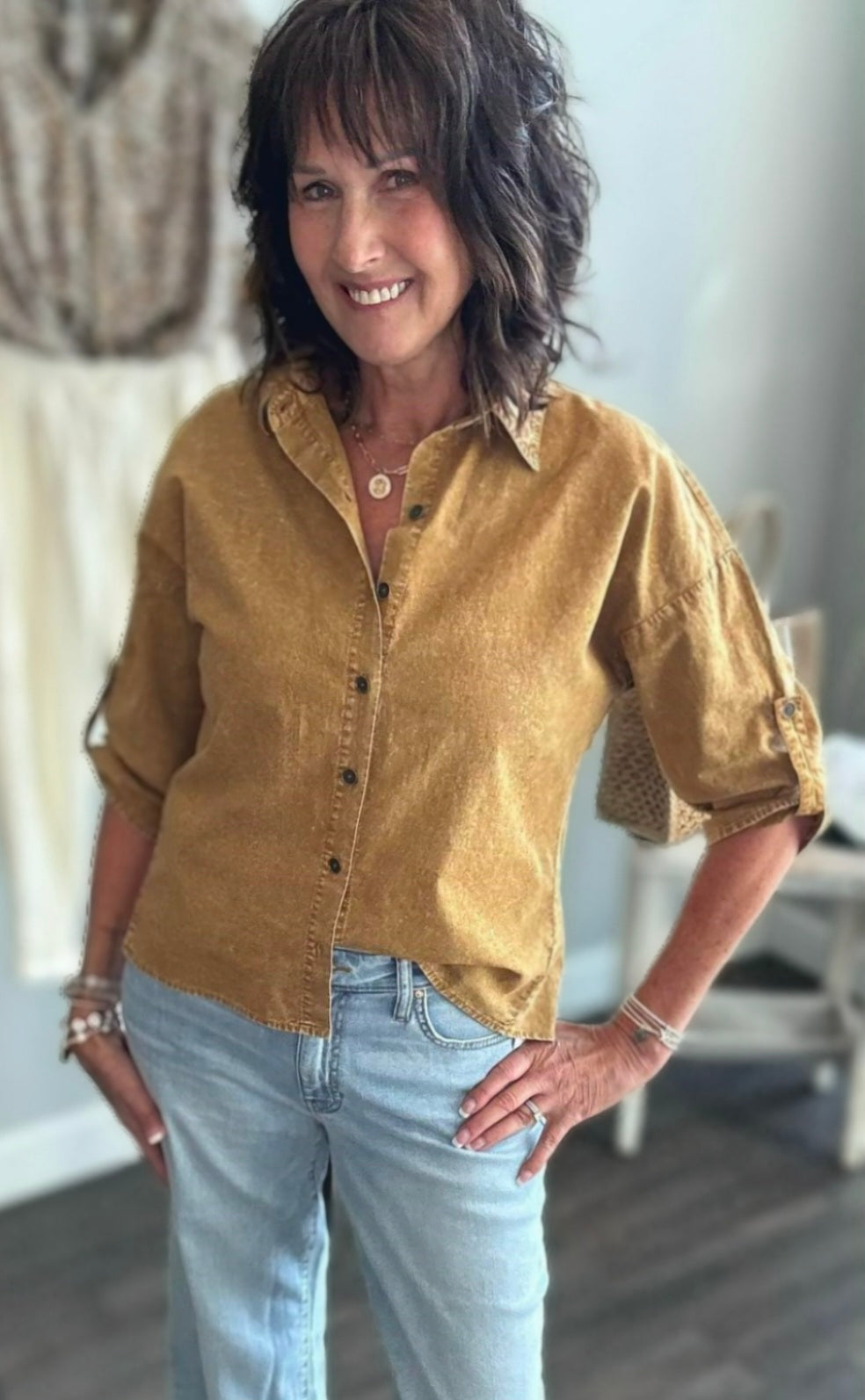 Effortlessly chic, the Carrie Button Up Top is a must-have. With 3/4 sleeves and a playful ton of buttons, this top adds a fun twist to any outfit. Get ready to turn heads in this quirky and stylish piece!