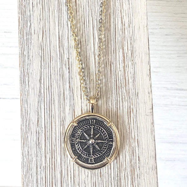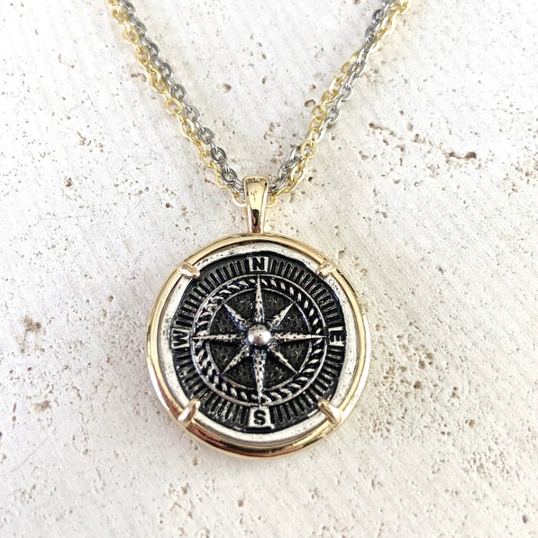 The Compass Coin Necklace is a sophisticated multi-chain piece combining a lustrous gold chain with a sleek silver chain. This harmonious fusion of metals creates a balanced and contemporary look, perfect for elevating both casual and formal outfits. Designed to effortlessly blend with a variety of styles, it offers a polished statement of elegance and versatility.