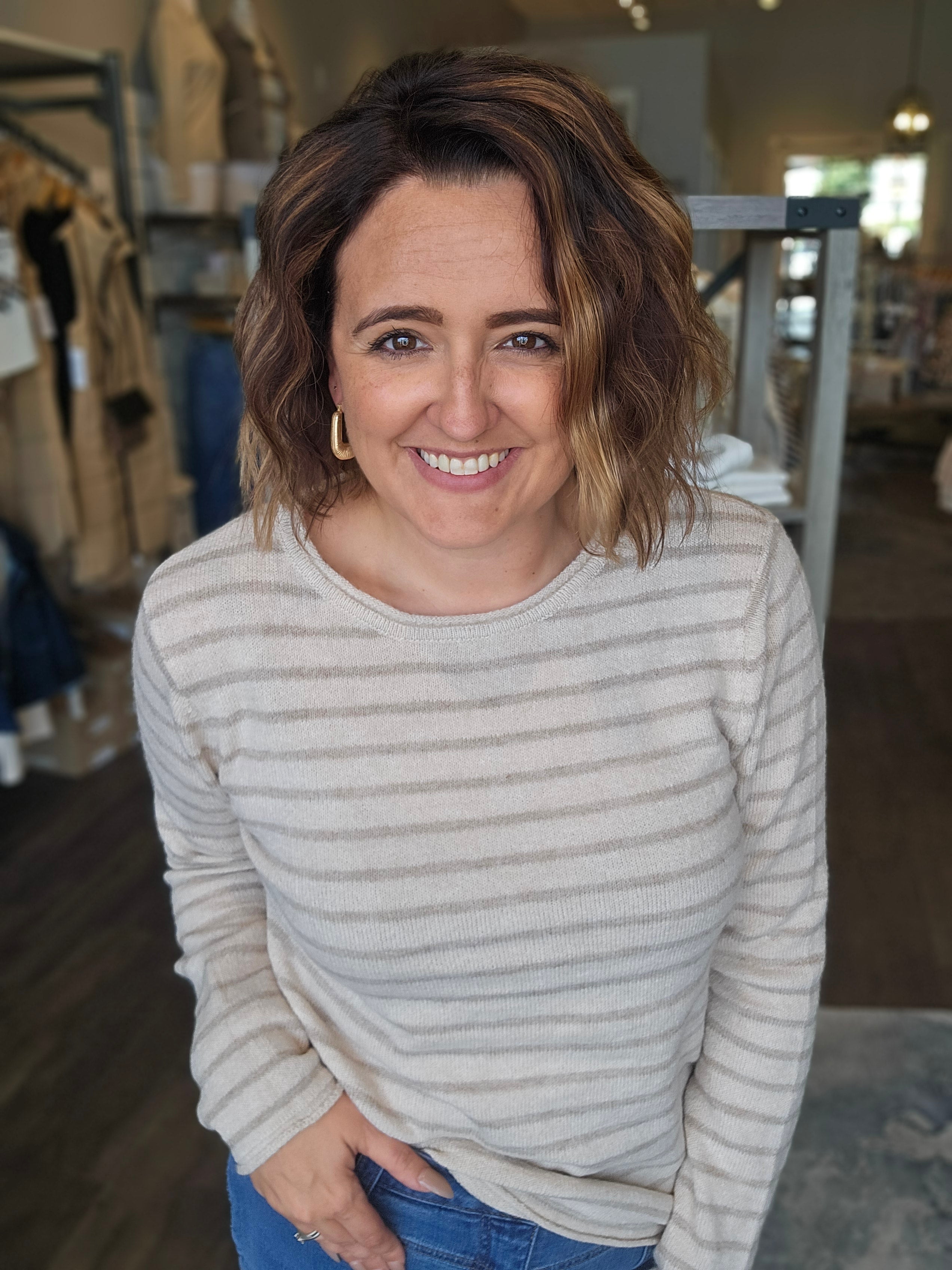 Cozy meets cool in this crew neck striped sweater, featuring a super soft oatmeal base with a playful mocha stripe. Perfect for layering or wearing solo, it adds a touch of effortless style and comfort to any outfit. Wrap yourself in warmth and fun all season long!