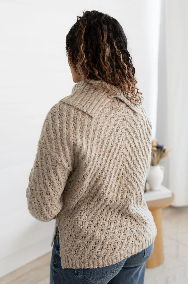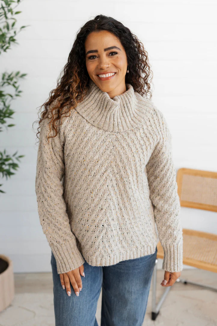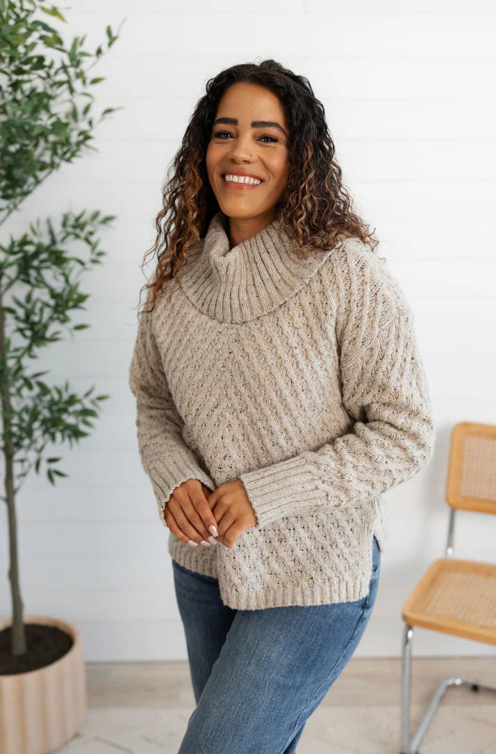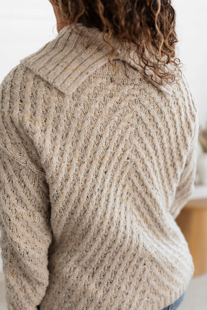 The Diagonal Cable Sweater with Split Collar combines timeless elegance with contemporary design. Featuring a sophisticated turtleneck collar that gently splits for a unique silhouette, this sweater showcases a textured diagonal cable knit pattern. Perfect for adding a polished touch to your wardrobe, it offers both warmth and refined style for any occasion.