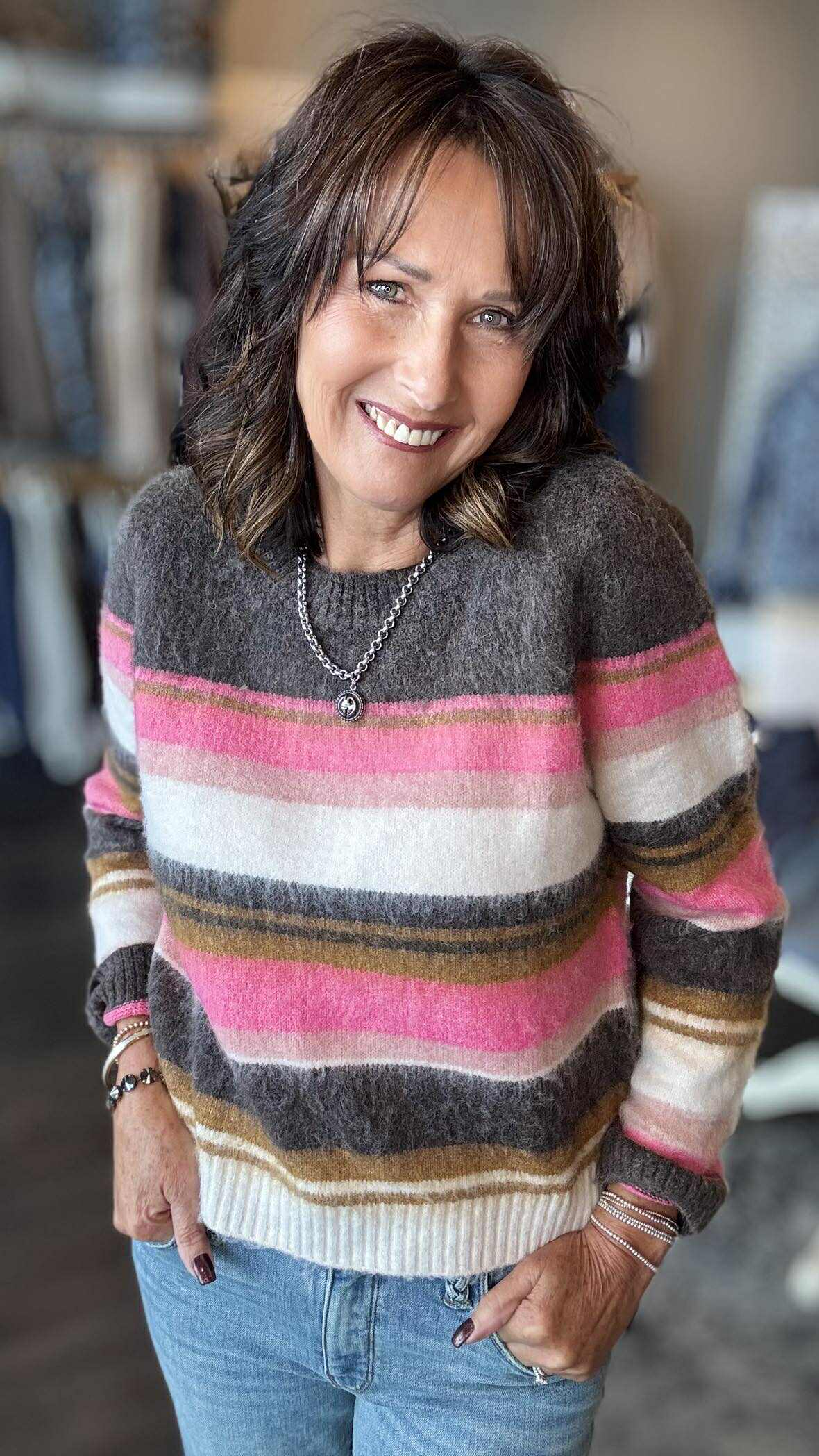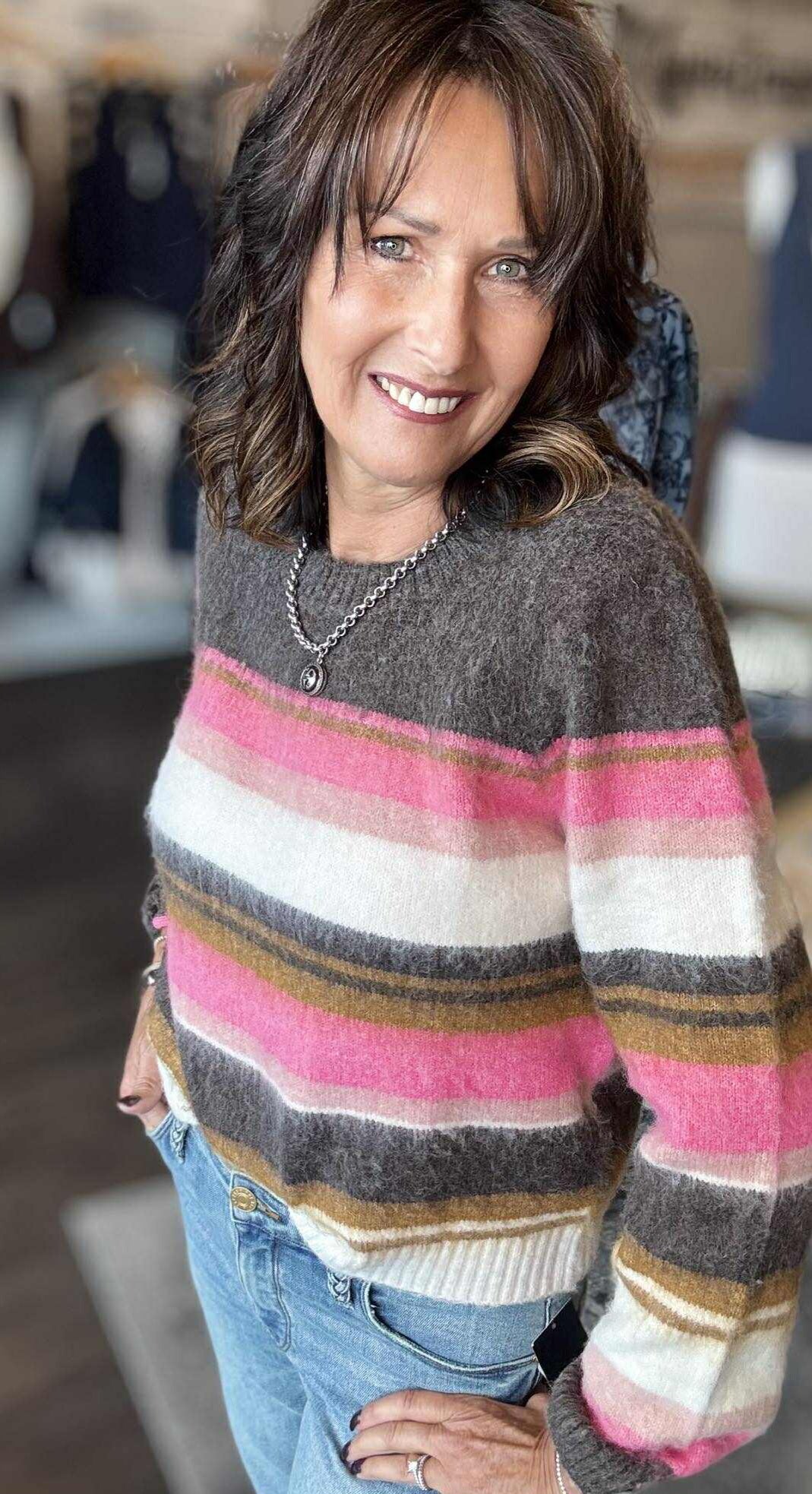 Bring a pop of fun to your wardrobe with the Elvira Striped Pullover Sweater. Featuring vibrant brown and pink stripes, this cozy sweater adds a cheerful twist to any outfit. Perfect for layering on chilly days, it combines comfort and style with a playful flair you'll love to wear again and again.