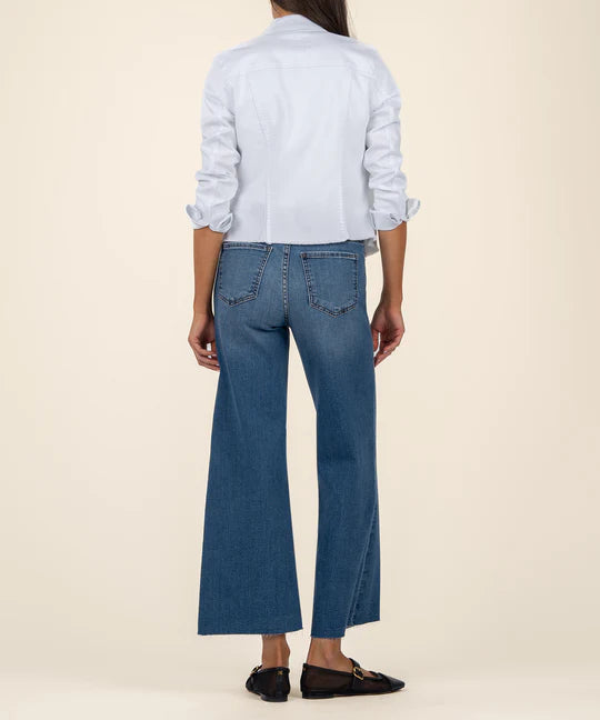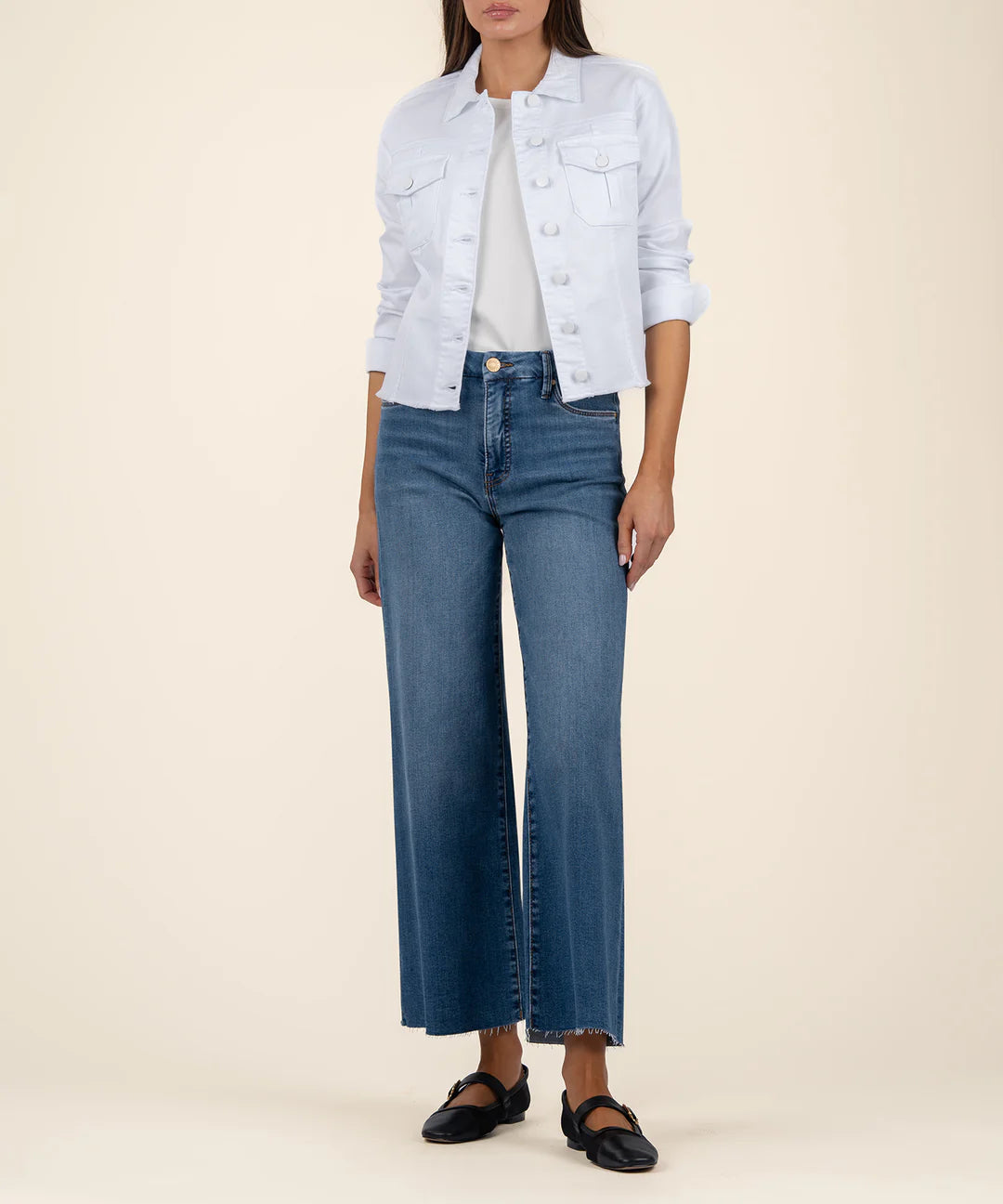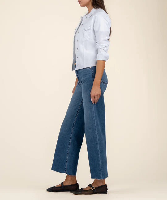 Step into effortless style with our High Rise Fab Ab Wide Leg Denim in a flattering medium wash. Designed to hug your waist and flow with a wide-leg silhouette, these jeans feature a trendy raw hem for a touch of cool edge. Perfect for showing off your fab abs while keeping comfort front and center, they’re your new go-to for playful, laid-back looks.