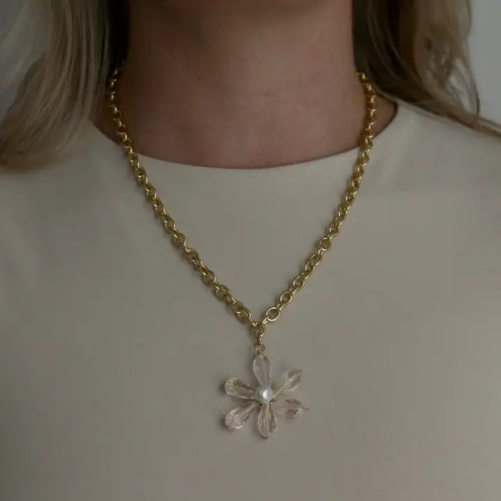 This necklace features a hand-wrapped crystal flower made of beautiful crystal quartz beads with a pearl center. This unique piece is will be a one-of-a-kind treasure you will cherish measures approx19-20 1/2"