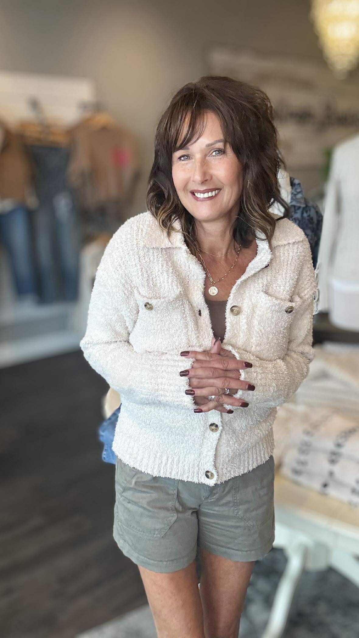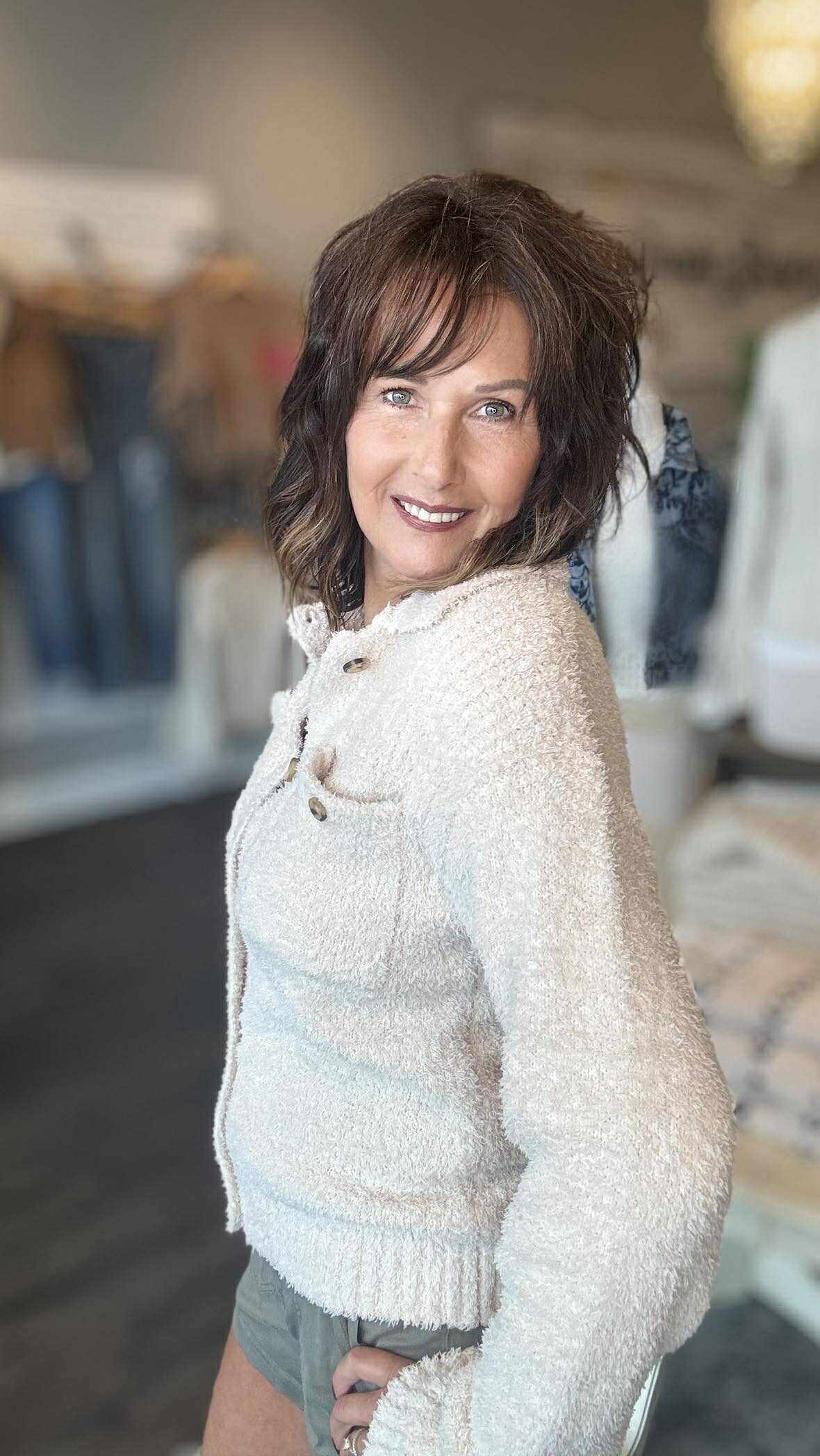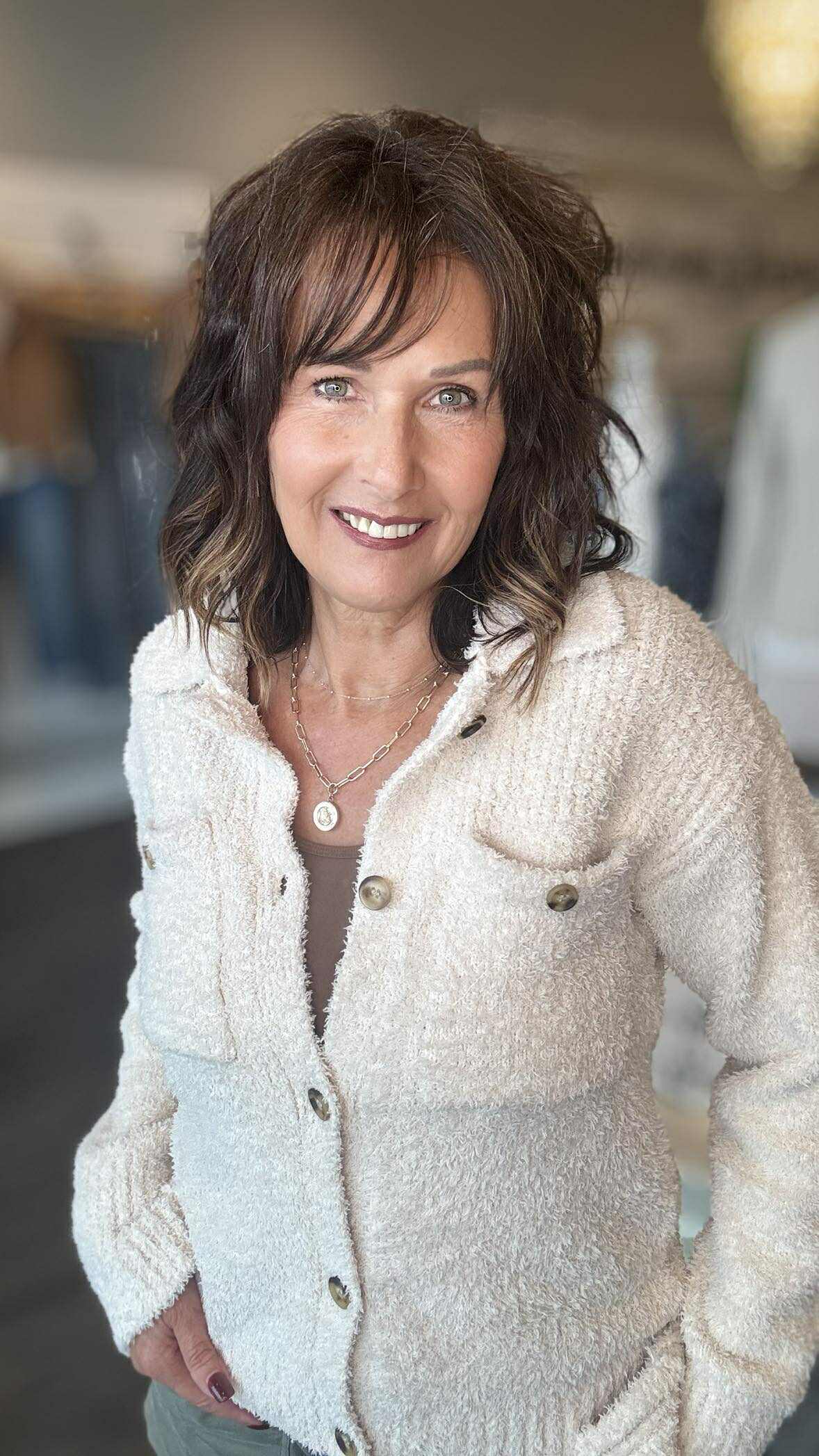 Elevate your outerwear with the Lois sweater jacket, featuring a classic button-down design with rich brown buttons and practical chest pockets. This sherpa jacket combines warmth and style effortlessly, making it an ideal choice for a refined, cozy look. Perfect for layering, it adds a sophisticated touch to any outfit while providing comfortable insulation.