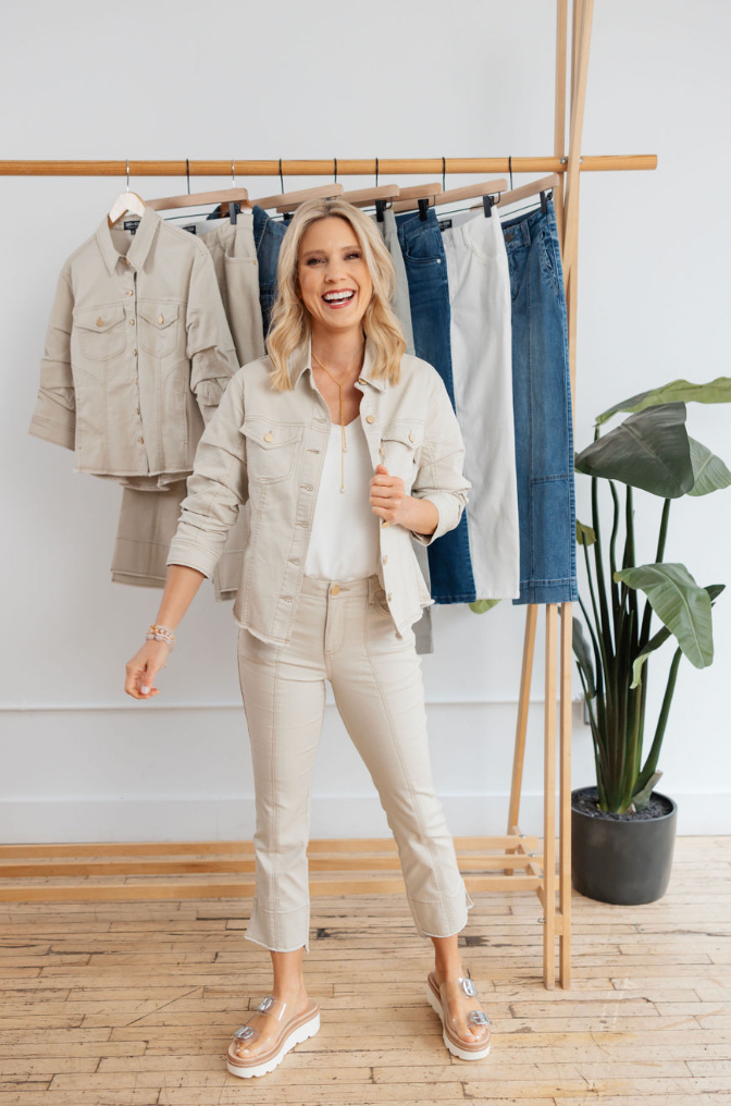 This versatile jacket is the perfect blend of style and utility, making it an essential addition to your wardrobe. Crafted in a soft birch color, it features a classic button-up front and structured collared neckline for a timeless look. With two functional chest pockets and gold-tone buttons, it adds a subtle touch of sophistication. The lightweight fabric makes it ideal for layering, whether paired with denim for a casual look or dressed up over a sleek blouse. Effortlessly chic and endlessly wearable, this jacket is a staple for any season!