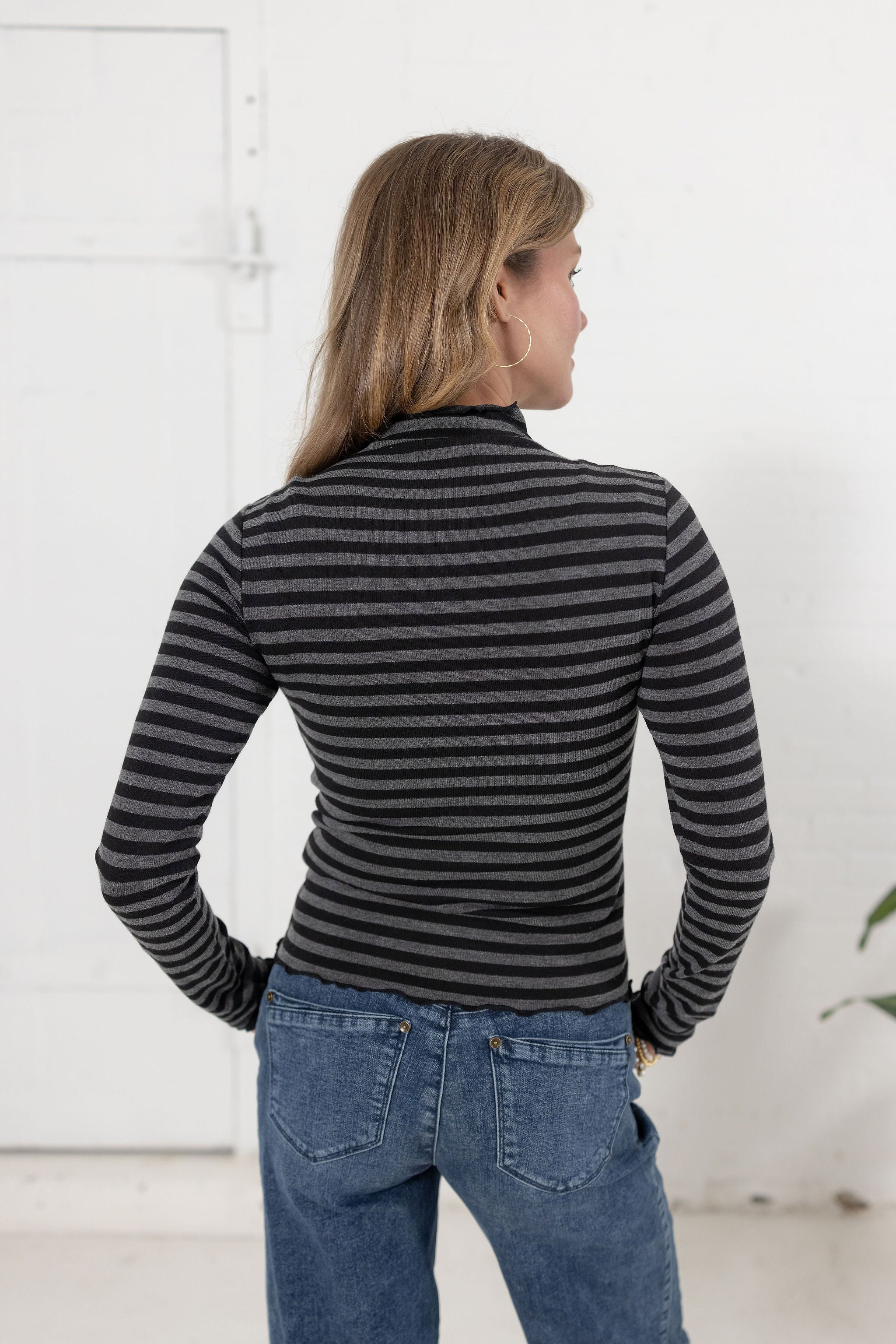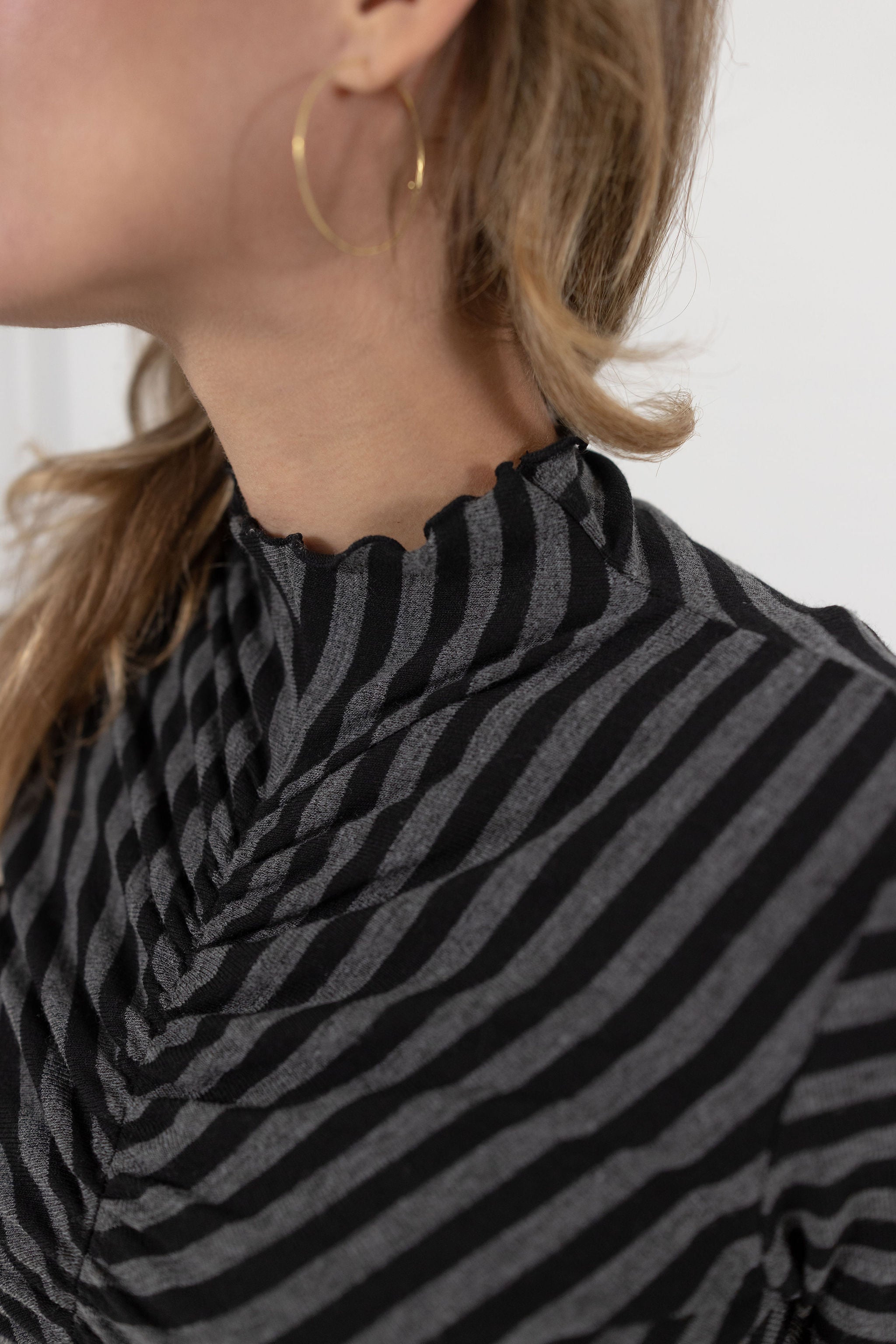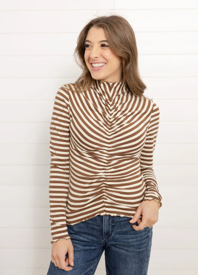 Make a bold statement with the Mac & Me Striped Top, featuring daring brown and ivory stripes that command attention. The ruched detailing adds texture and shape, emphasizing your confident style. Perfect for standing out while keeping a chic, effortless look.