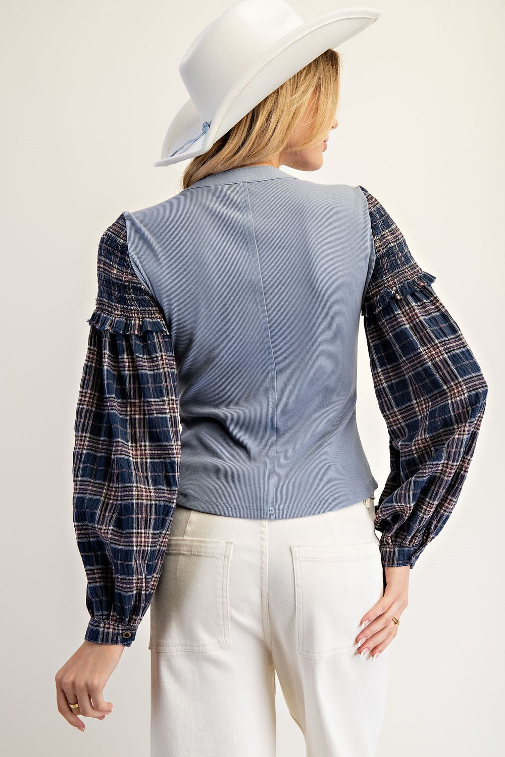 Bring a playful edge to your outfit with the Mineral Washed Plaid Sleeve Top, featuring eye-catching balloon plaid sleeves that add volume and charm. The soft mineral-washed fabric ensures all-day comfort, while the unique sleeve detail makes this top a standout piece for casual days or fun outings. Embrace cozy style with a twist!