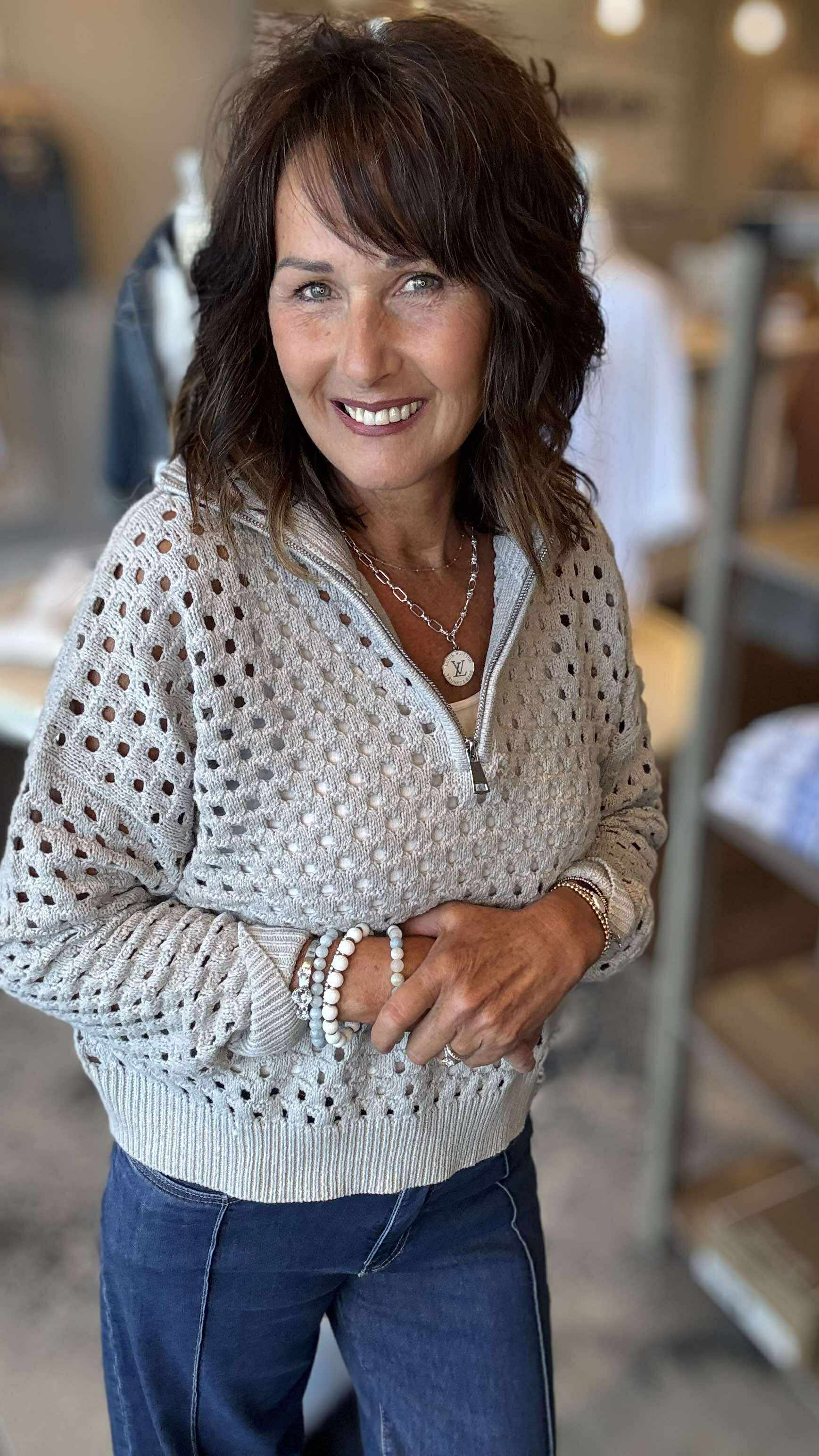 Elevate your style with this open knit heather grey 1/4 zip sweater. Its daring design combines breathable texture with a sleek quarter-zip, perfect for layering or making a bold statement on its own. Embrace comfort and edge in one versatile piece.
