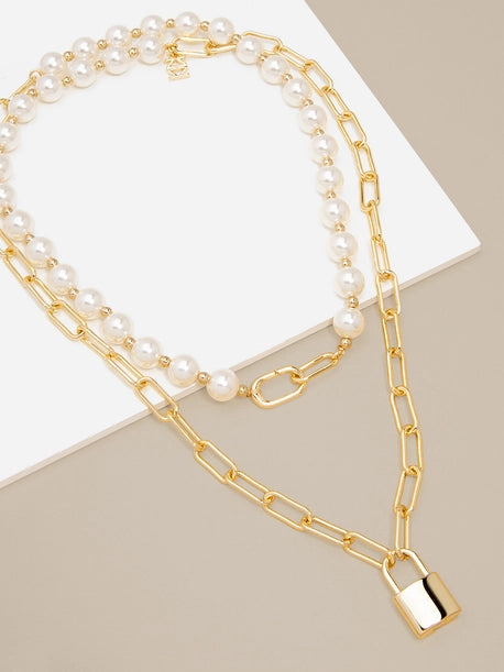 Break fashion rules with our Pearl and Link Gold Lock Necklace – a bold fusion of rebellious edge and classic luxury. The unexpected pairing of pristine pearls with chunky gold links creates delicious tension, while the statement lock pendant adds a provocative touch of mystery. Not for the faint-hearted, this conversation-starting piece demands attention and transforms even the simplest outfit into a daring style declaration. Lock in your fearless look.