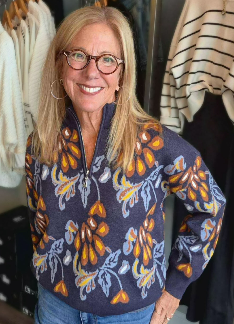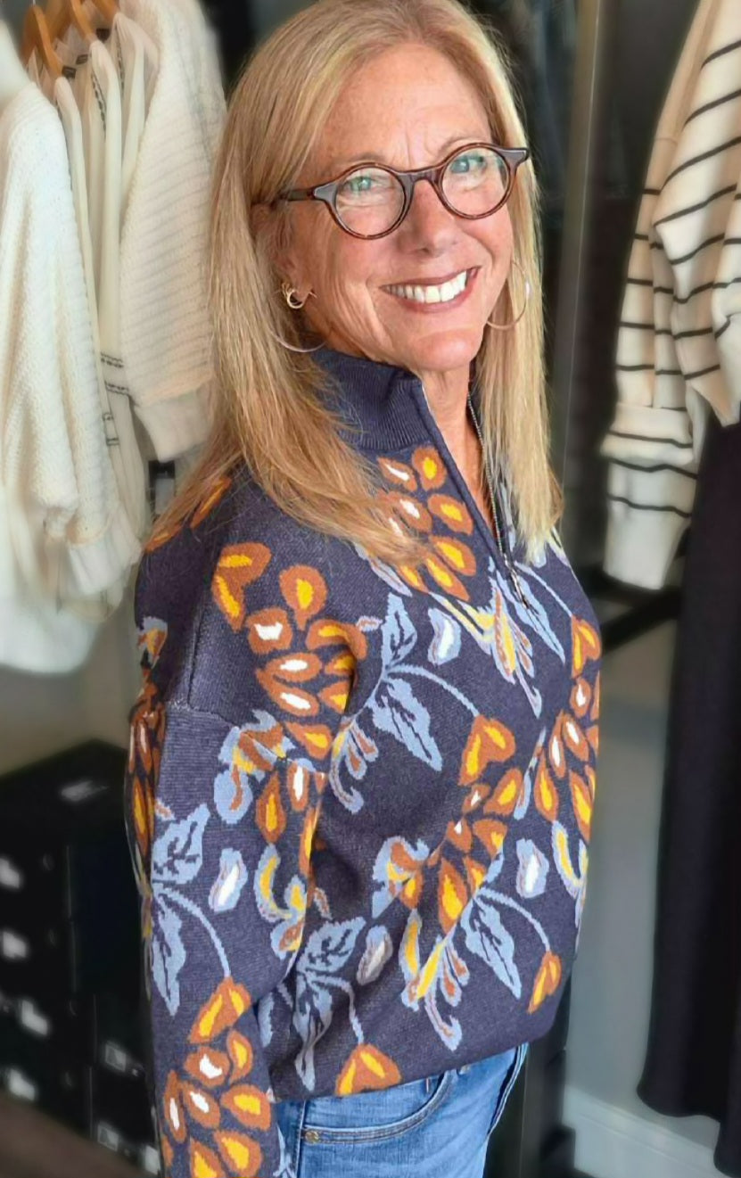 This daring Quarter Zip Sweater blends deep navy with bold rust yellow floral accents for a striking contrast. Its vibrant pops of color energize your outfit while offering cozy comfort. Perfect for standing out with confident style, this sweater turns everyday wear into a bold fashion statement.