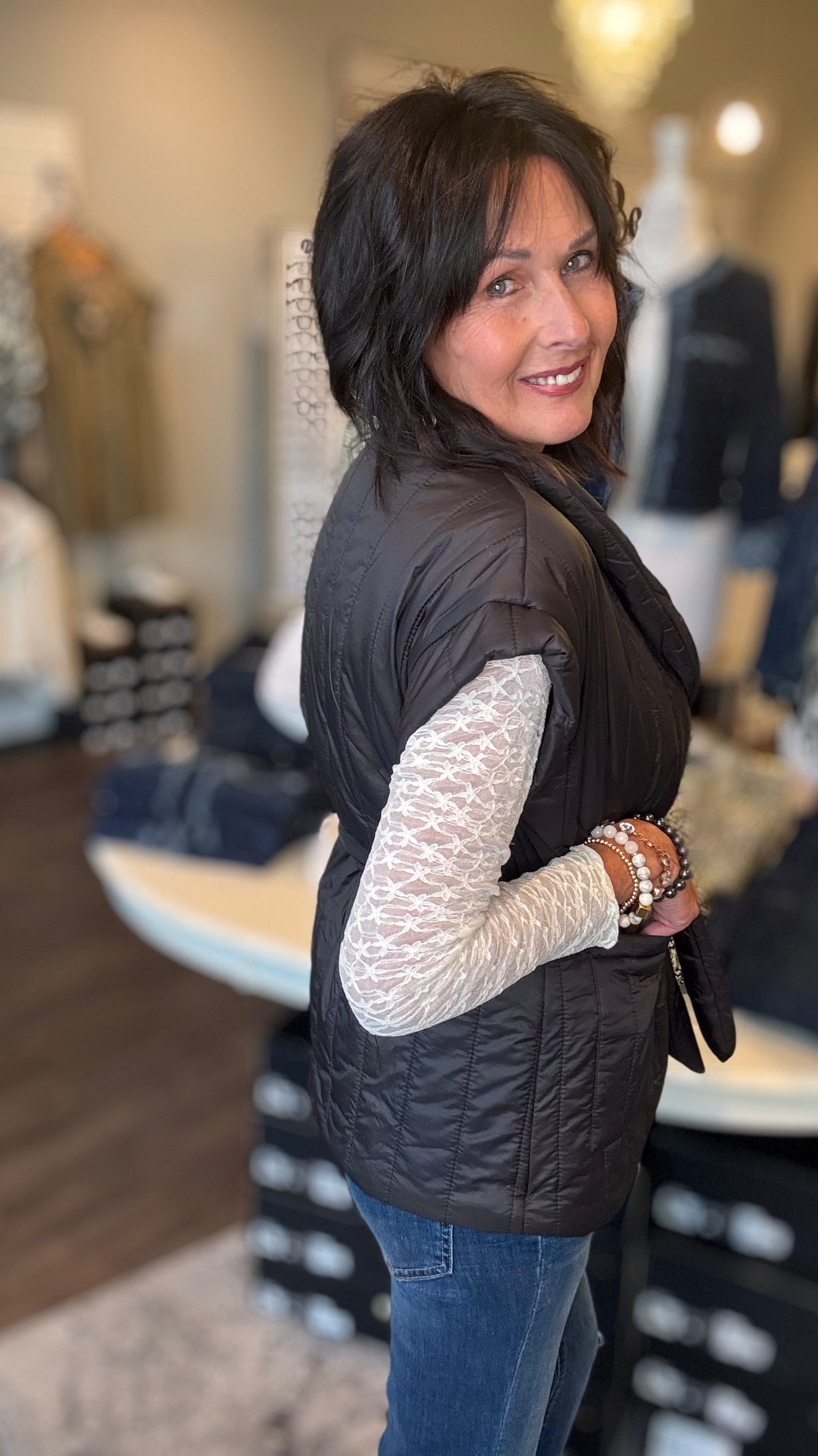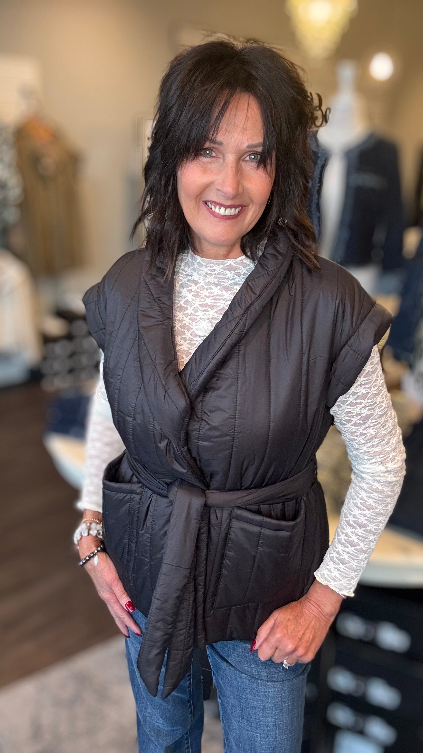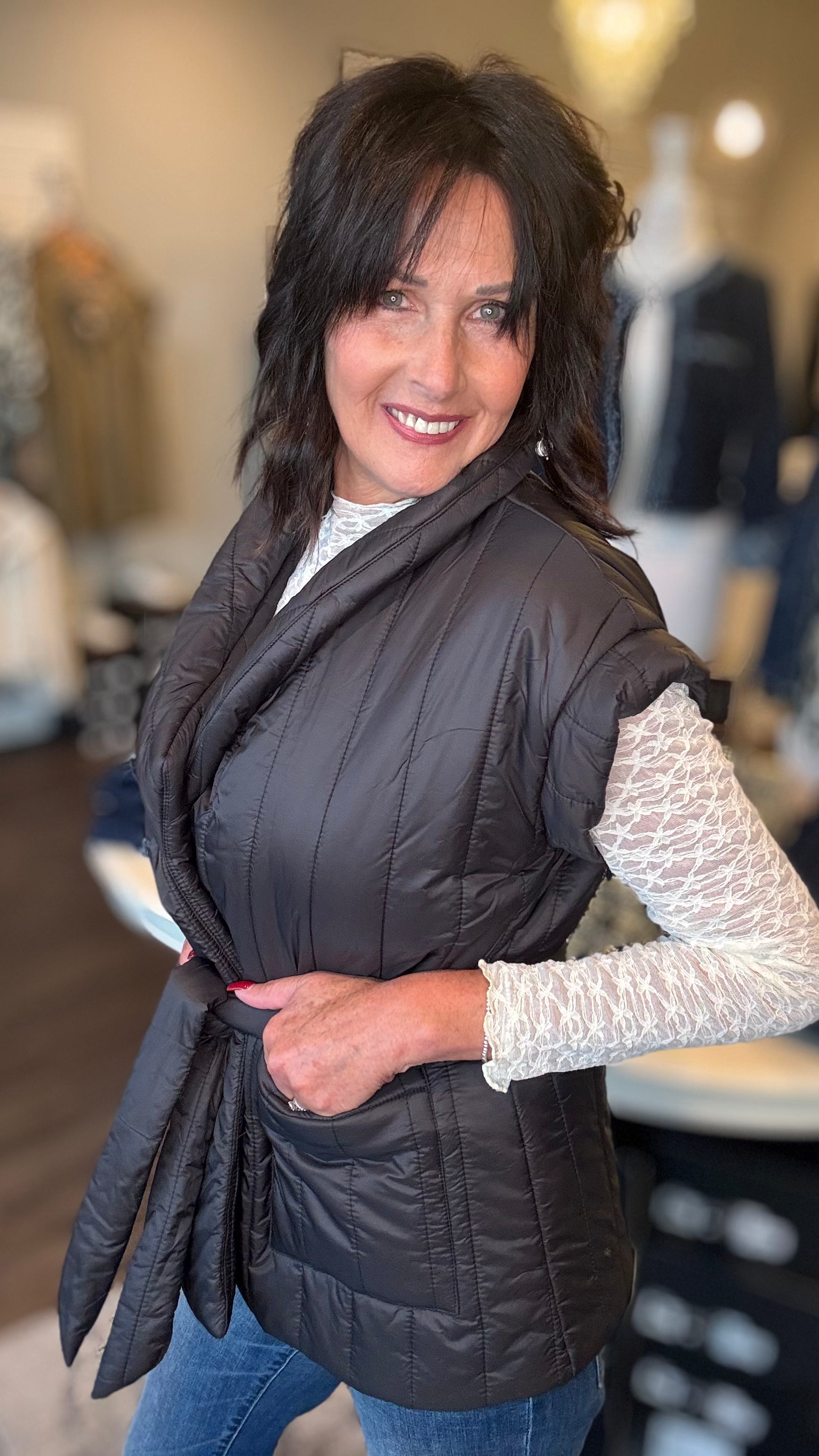 Wrap yourself in cozy charm with this quilted black vest featuring a playful tie closure—no buttons or zippers to fuss with! Perfect for layering, it adds warmth and style while keeping things simple and fun.