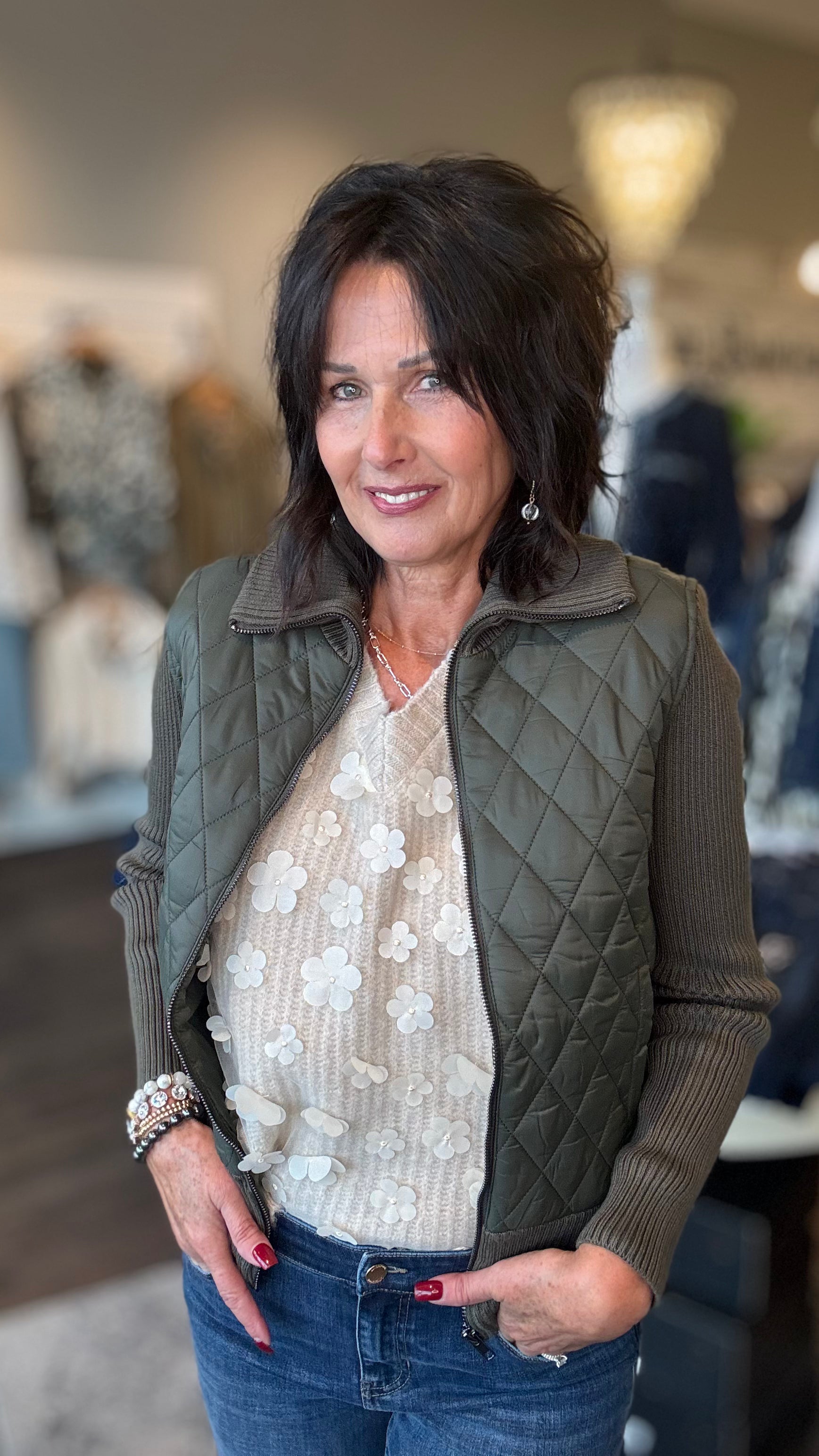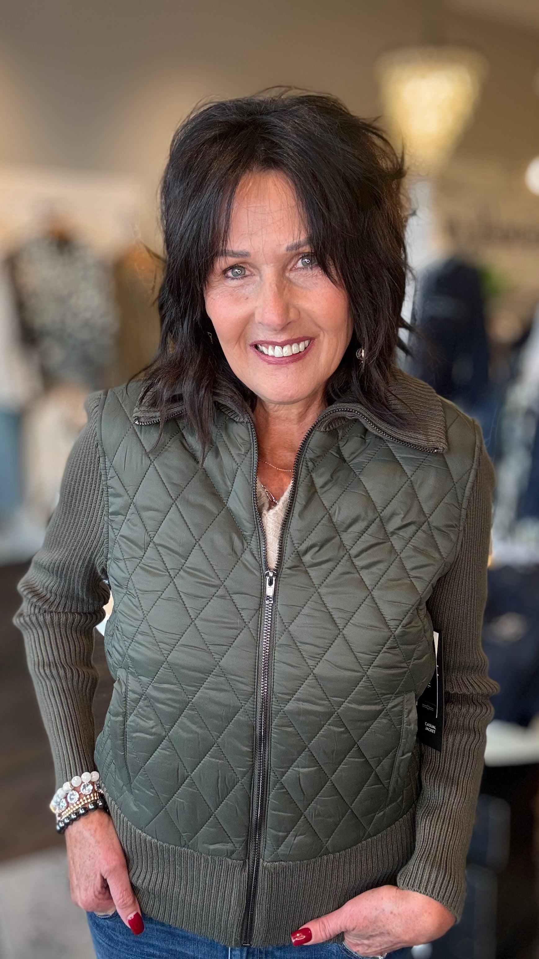 Elevate your wardrobe with this quilted jacket featuring elegant sweater ribbed sleeves in a deep Hunter Green. Designed for refined comfort, it blends classic quilting with a modern silhouette, offering warmth and style for cooler days. The rich green hue adds a touch of sophistication, making it an ideal choice for both casual and polished looks.