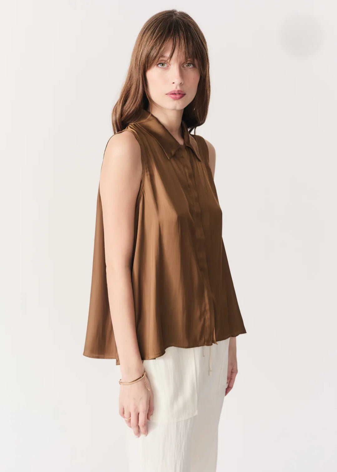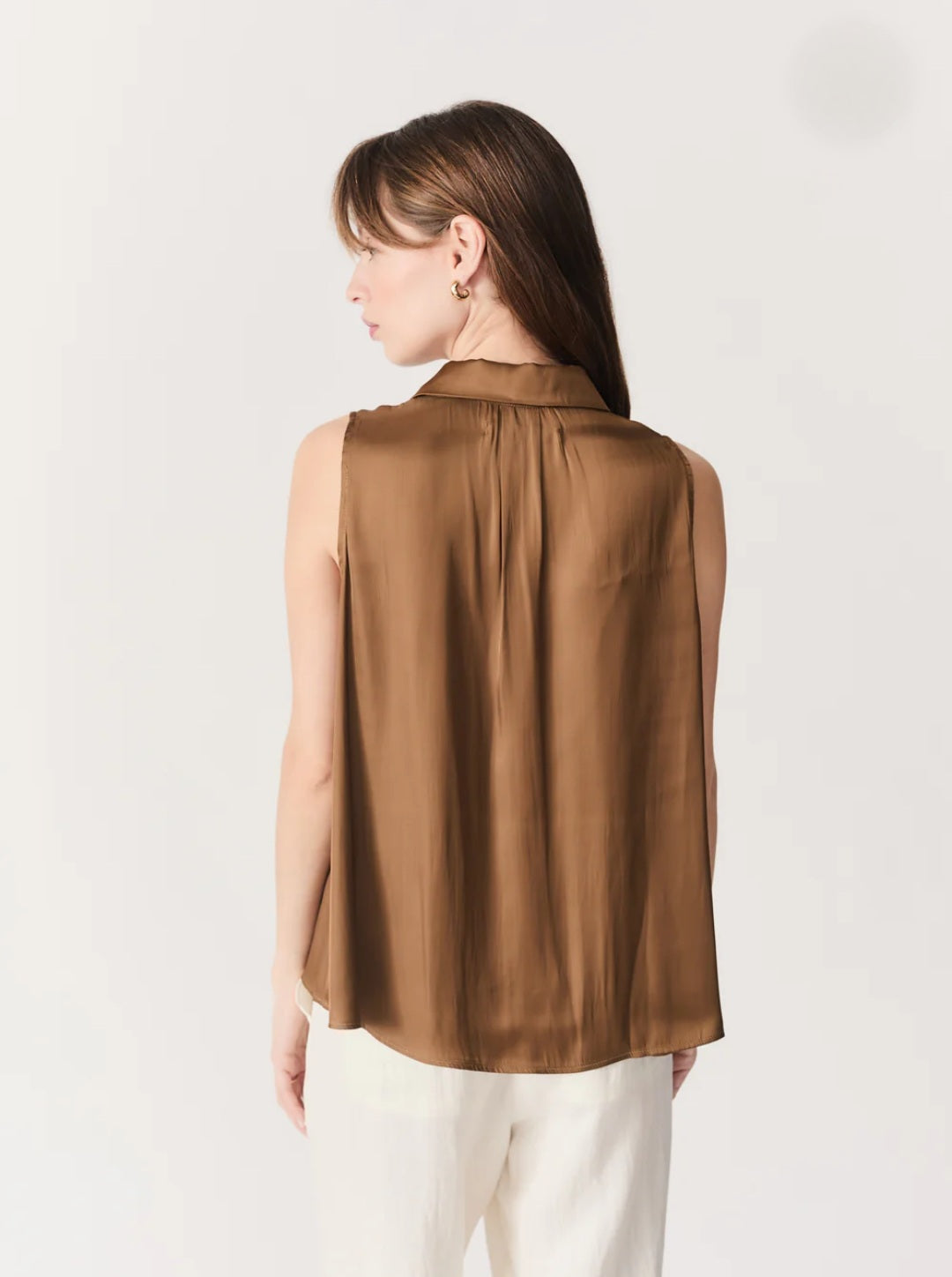 The Rachel Shirt presents a study in refined elegance with its sumptuous satin construction. This sleeveless silhouette features a distinguished lapel collar that frames the décolletage with architectural precision. The absence of sleeves creates a streamlined profile, while the lustrous fabric catches light beautifully, making this sophisticated piece ideal for both professional ensembles and evening attire.