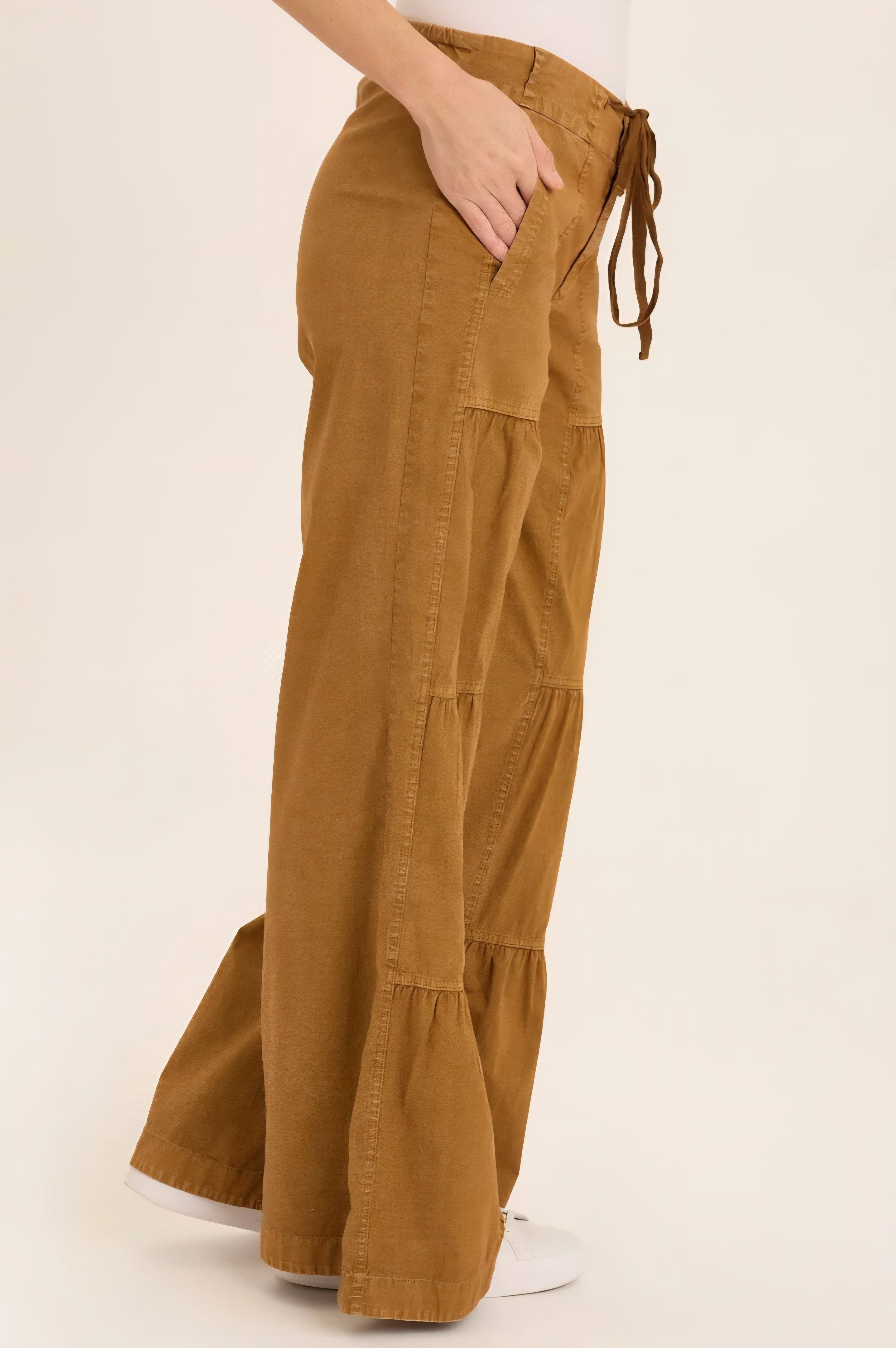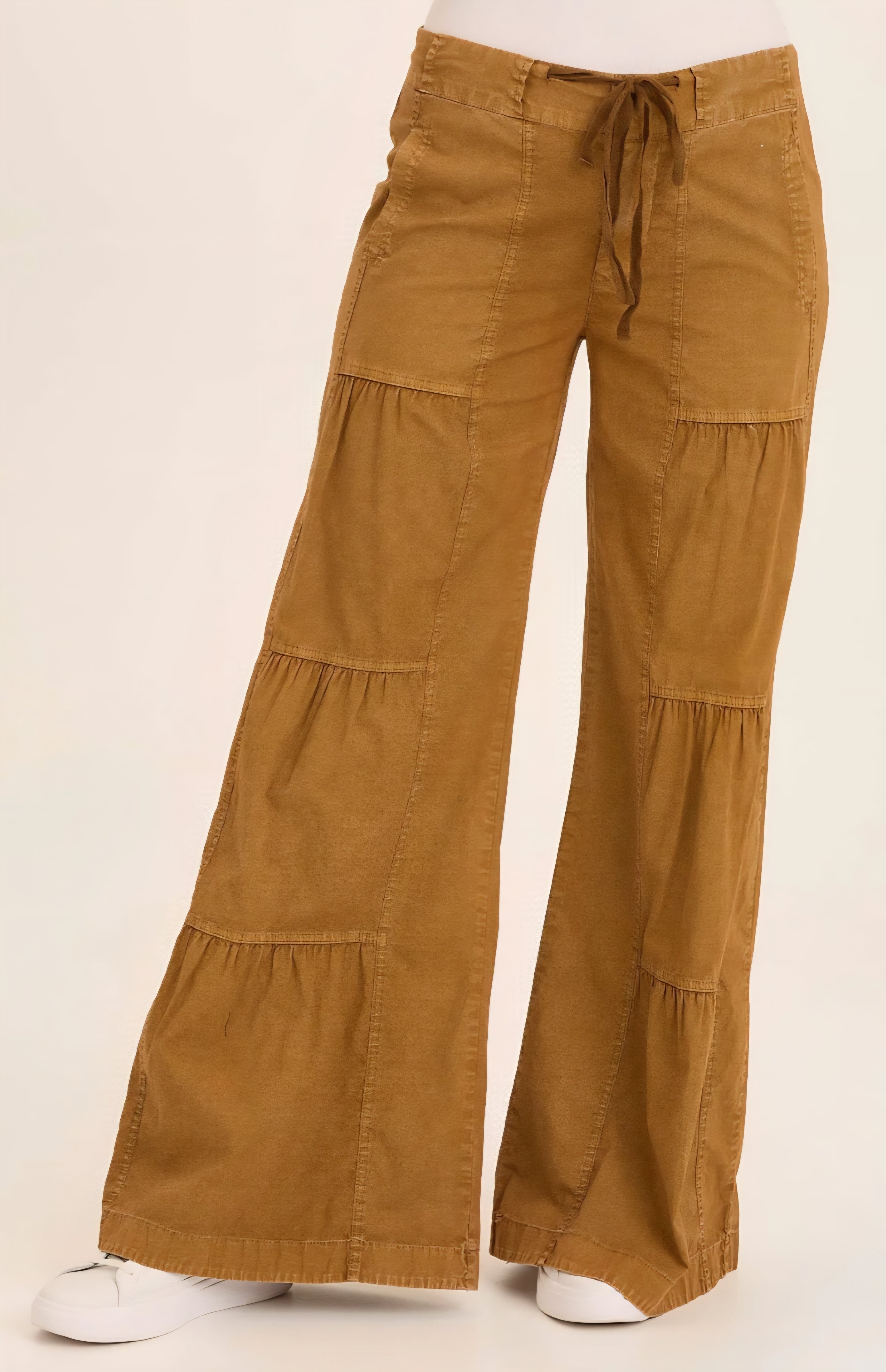 Unleash your adventurous spirit with our Terraced Wide leg pants in a stunning camel color. Featuring a tie front waist, these pants are perfect for taking on any challenge in style. Embrace the benefits of both comfort and boldness with these wide leg pants that will surely make a statement.