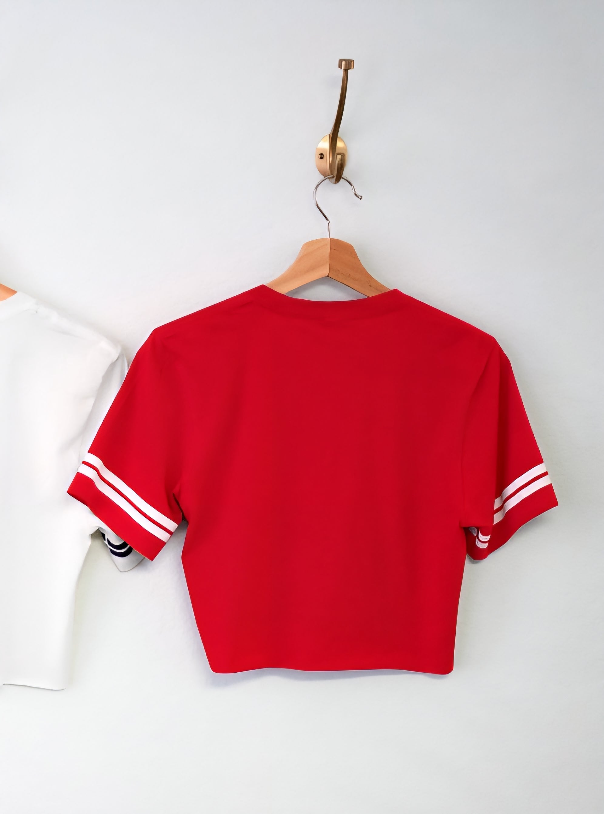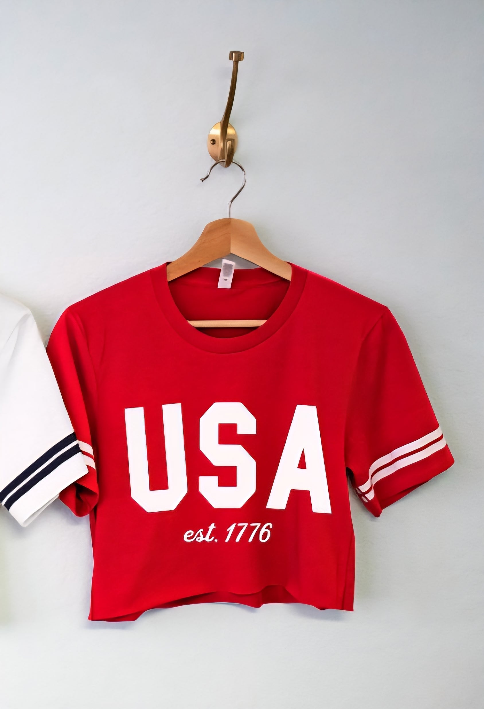 Show your patriotic spirit with this USA striped sleeve crop top. Featuring bold red and white stripes on the sleeves and a crisp design inspired by 1776, it’s perfect for summer celebrations or casual outings. The cropped fit adds a trendy edge while keeping you comfortable and stylish. Make a statement and celebrate freedom in fashion-forward style.