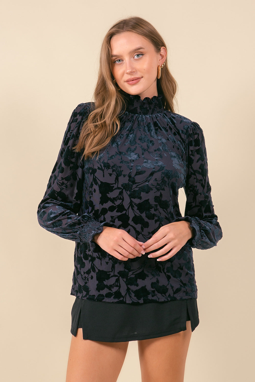 Velvet Floral Blouse with Mock Neck