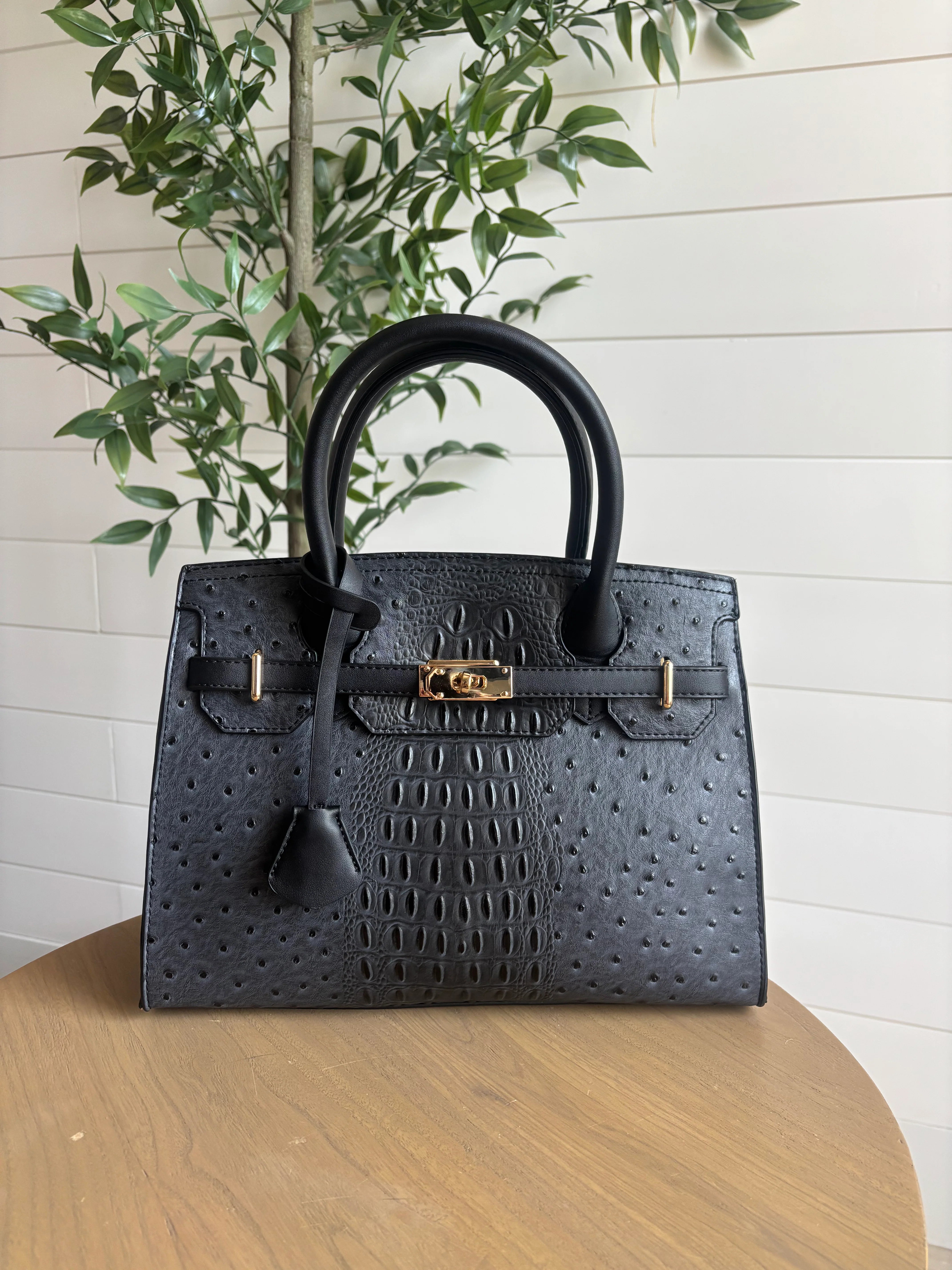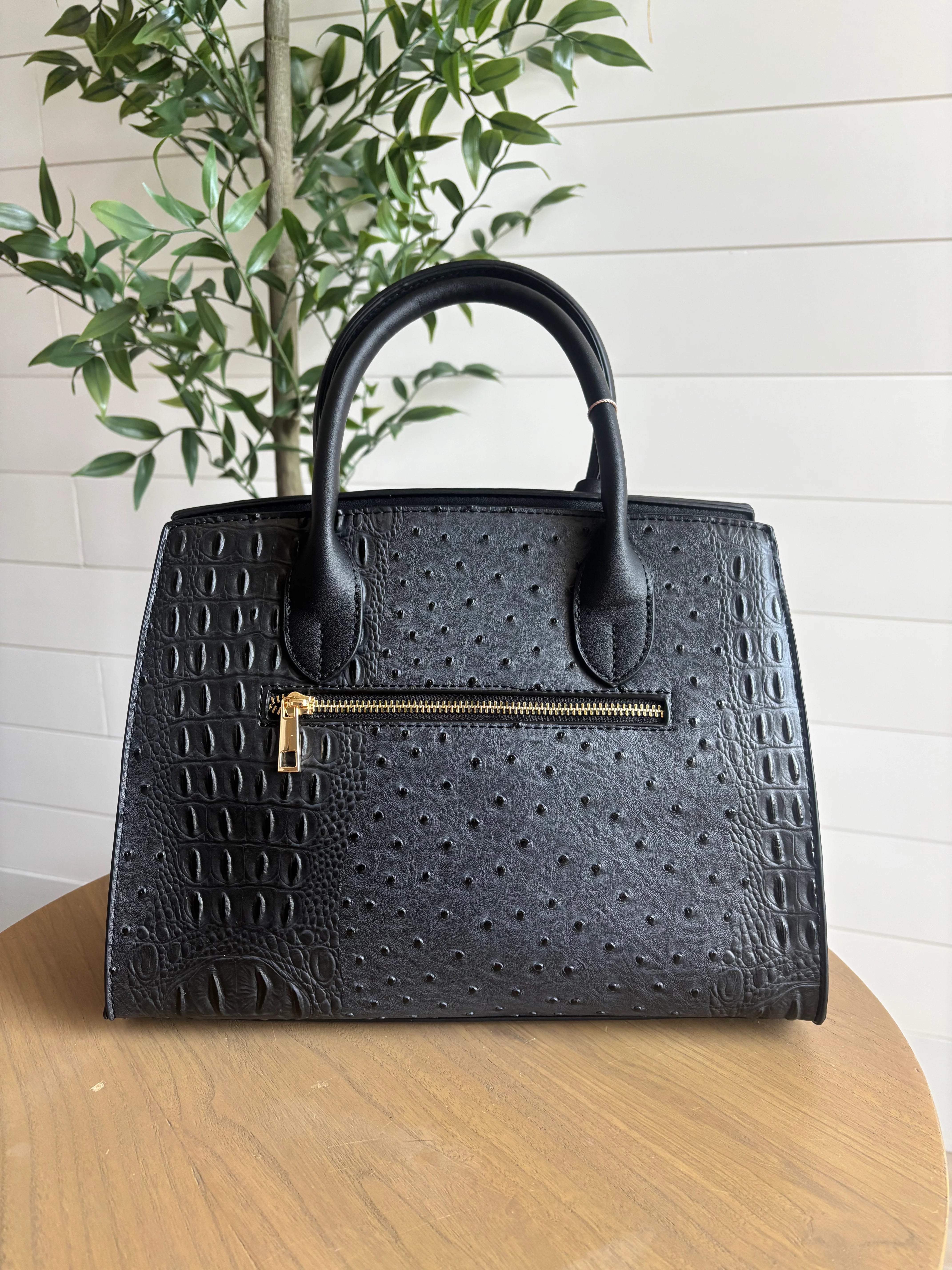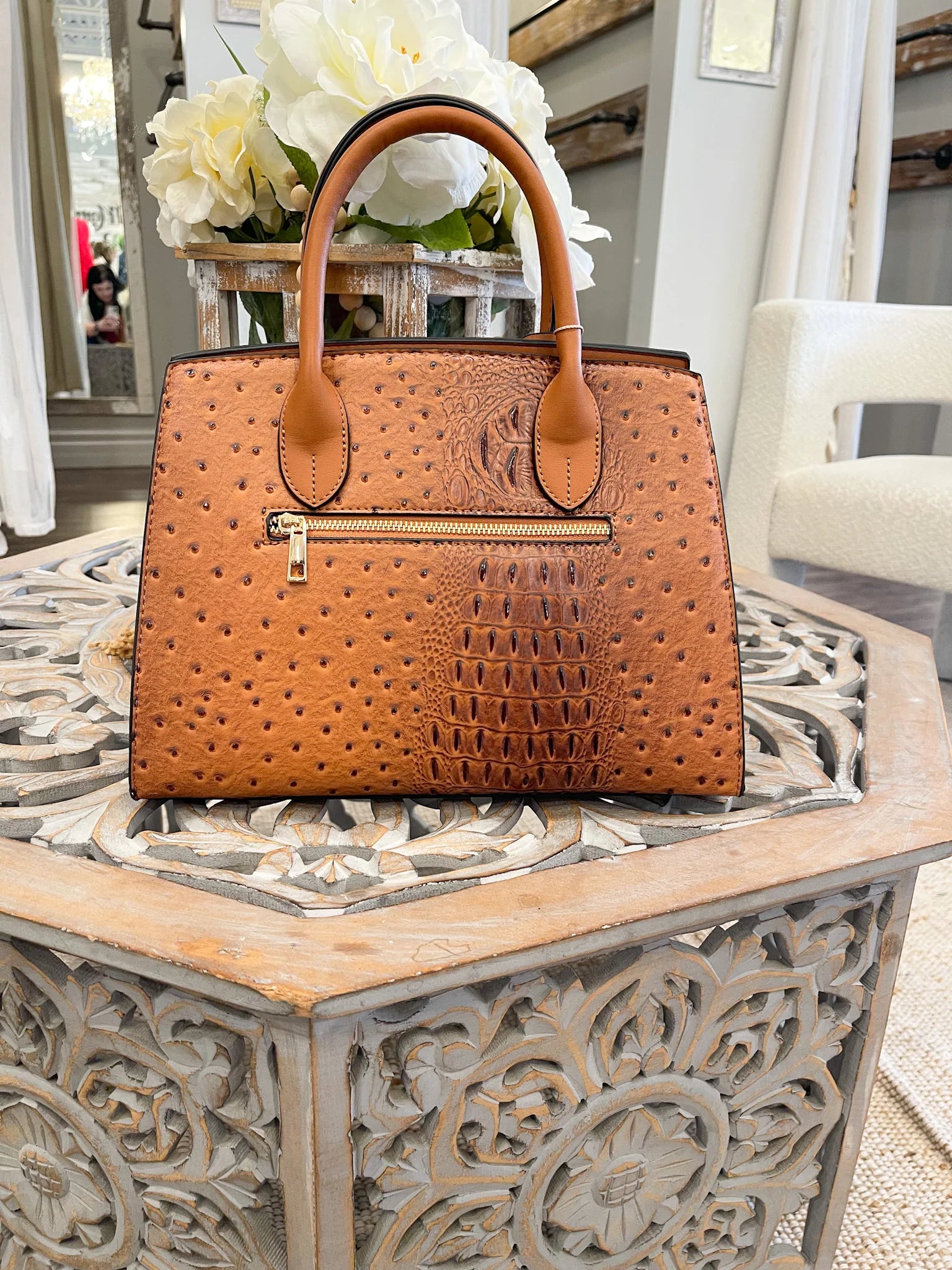 Discover timeless elegance with the Virginia Ostrich Structured Satchel, available in rich cognac or classic black. Crafted with a luxurious ostrich texture, this satchel combines durability with sophisticated style. Its structured silhouette keeps your essentials organized while adding a polished touch to any outfit. Whether for work or a night out, choose cognac for warm, versatile charm or black for sleek, enduring sophistication. Elevate your accessory collection with this must-have bag.