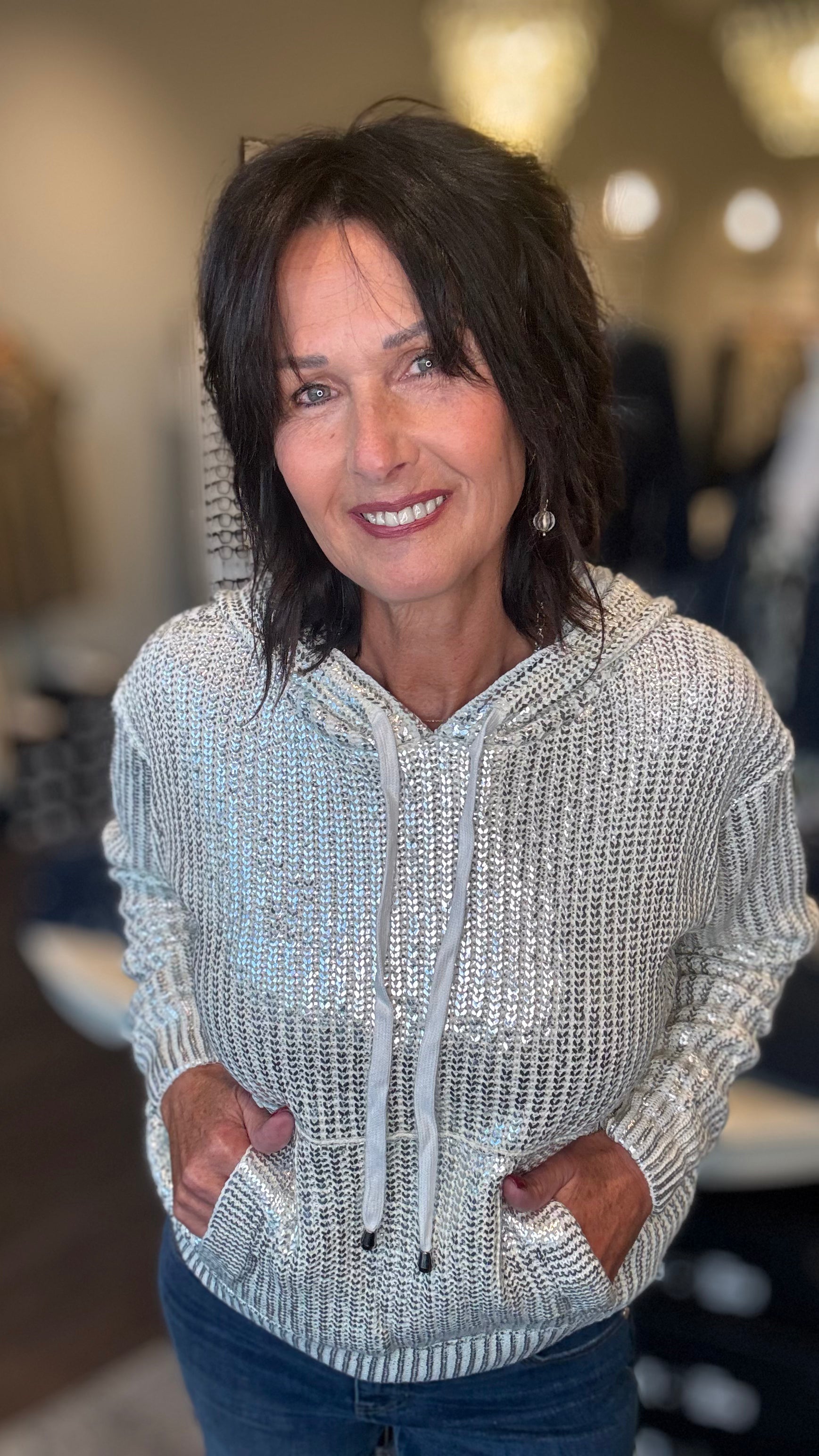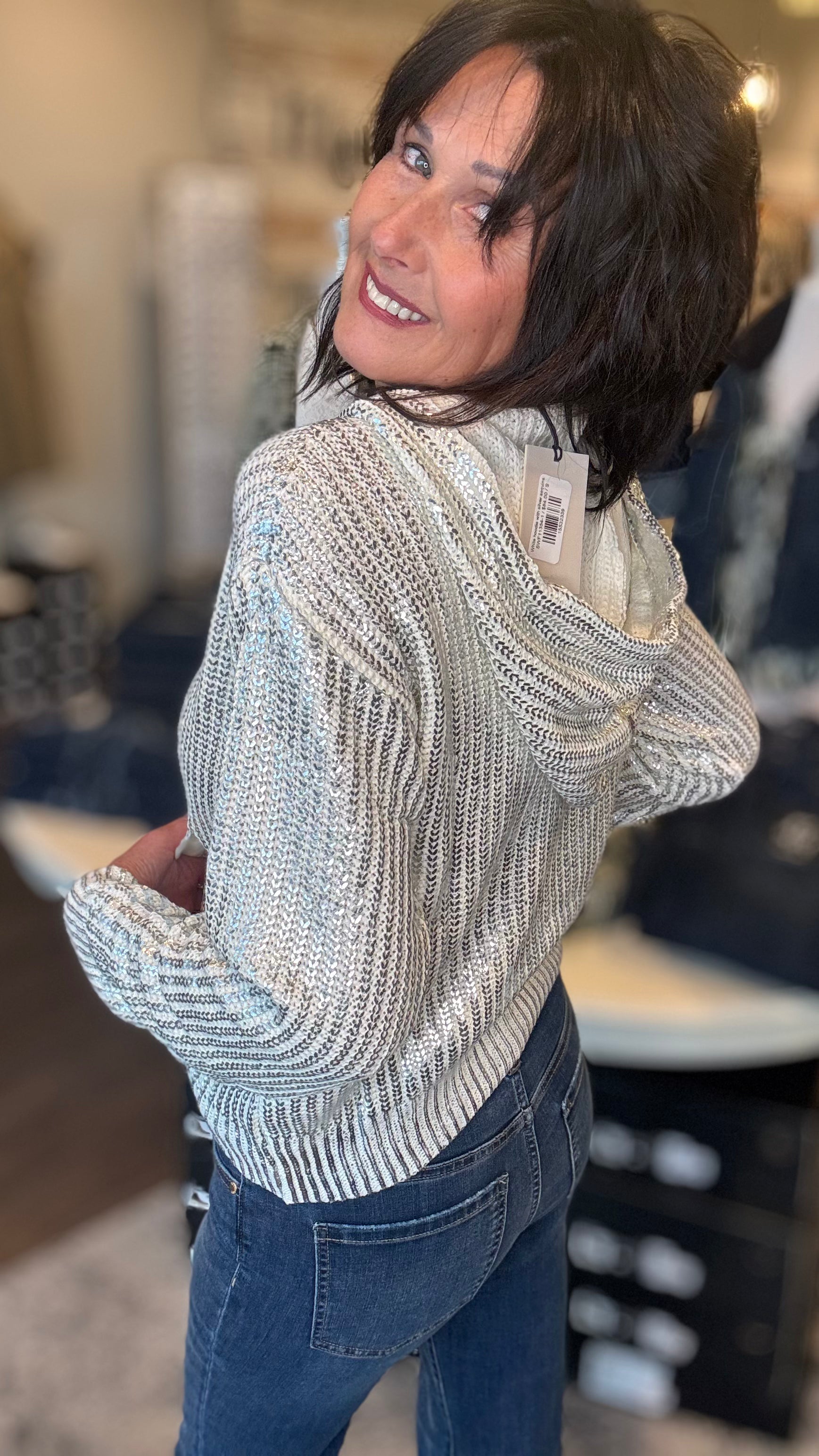 Stand out boldly in this white hoodie adorned with shimmering silver sequins. Its striking contrast combines cozy comfort with eye-catching sparkle, perfect for making a fearless fashion statement wherever you go. Elev